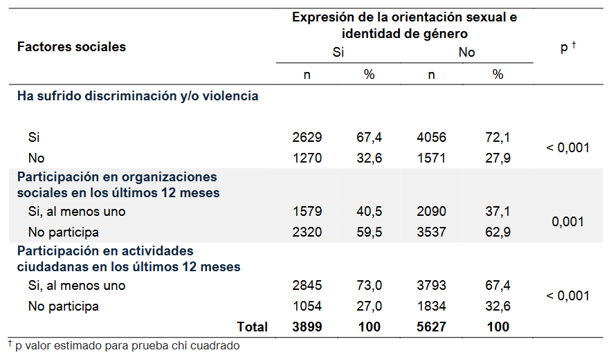 Objetivo: Determinar los factores asociados a la expresión de la orientación sexual e identidad de género en personas lesbianas, gays, bisexuales, trans e intersexuales. Material y métodos: Estudio analítico y transversal, de fuentes secundarias, basado en la “Primera Encuesta Virtual para Personas LGBTI” del 2017, en el que se analizaron los registros de 9526 personas. Se estimaron frecuencias absolutas y relativas, y se utilizó la prueba chi cuadrado (x2) a un 95 % de nivel de confianza. Resultados: El 59 % de las personas no expresaron su orientación sexual e identidad de género. Referente a los factores personales, en el grupo que sí se expresaron, 38% conocía instituciones que defienden sus derechos y 32 % consideró que existe respeto hacia esta comunidad. Además, que algún familiar conozca su opción sexual (89,5%) y tener pareja (51,9%) fueron los factores familiares más frecuentes en este grupo de personas. Entre los factores sociales, la mayoría de personas que se expresó no había sufrido discriminación (32,6%), participaba en organizaciones sociales (40,5%) y actividades ciudadanas (73%). Conclusiones: Los factores personales, familiares y sociales estudiados estuvieron asociados a la expresión de su orientación sexual e identidad en las personas lesbianas, gays, bisexuales, trans e intersexuales.